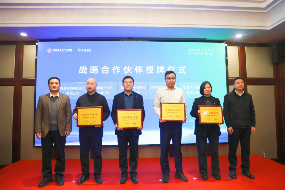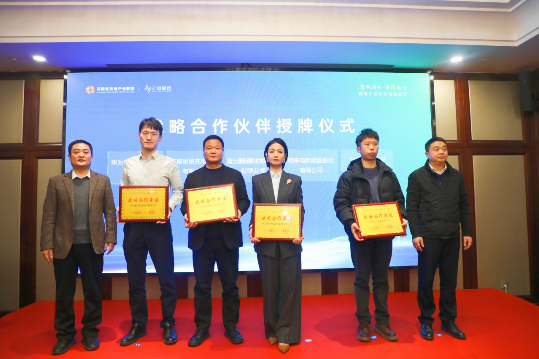 发布会上,中国中西部充电站建设运营生态大会战略合作伙伴授牌仪式同步举行。覆盖10余家优质企业:华为数字能源技术有限公司、万帮星星充电科技有限公司、富士康新事业发展集团有限公司、特来电新能源股份有限公司、宁德时代电服有限公司、隆基绿能科技股份有限公司、绿能慧充数字技术有限公司、河南水投资源开发管理集团、河南铁建投新基建有限公司、金冠电气股份有限公司、郑州池续新能源科技有限公司、河南鼎为智能技术有限公司、郑州市茂辰电子科技有限公司、郑州和动新能源有限公司、郑州叮叮智能科技有限公司、河南拓创电子科技有限公司、河南帝鹏科技有限公司等。