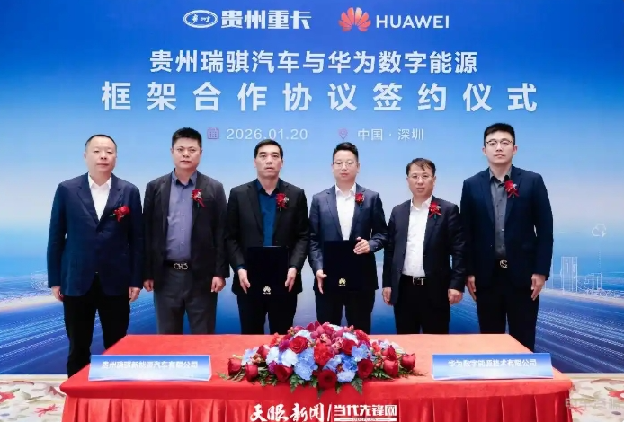 1月20日,贵州瑞骐新能源汽车有限公司(以下简称瑞骐汽车)与华为数字能源在深圳正式签署框架合作协议,双方将聚焦新能源重卡场景,深化战略协同,共同推动贵州新能源重卡产业发展。