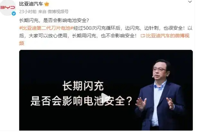有网友认为,闪充这么快,换电的价值不大了。也有网友表示,闪充对电网不好,而且过快的充电速度是否会损伤电池寿命、影响安全性和可靠性。面对争议,3月8日到3月9日,比亚迪官方微博连发4条视频对新技术进行说明。