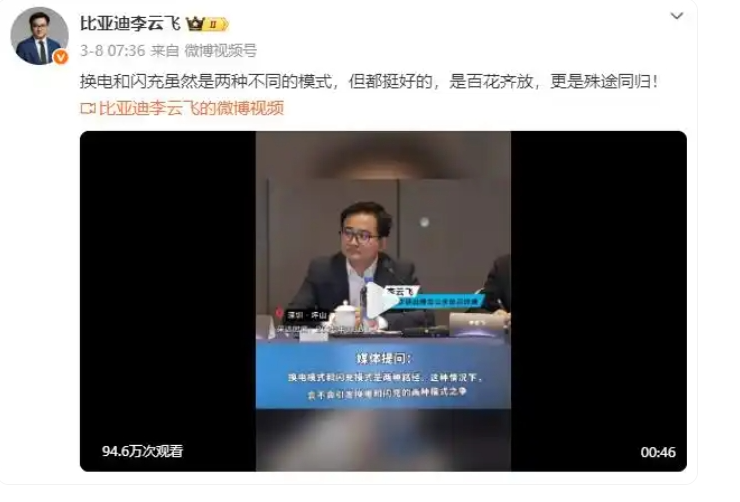 3月8日,比亚迪集团品牌及公关处总经理李云飞表示:“换电和闪充虽然是两种不同的模式,但都挺好的,是百花齐放,更是殊途同归!”两者的核心目标都是解决新能源汽车补能慢的痛点,促进油转电。