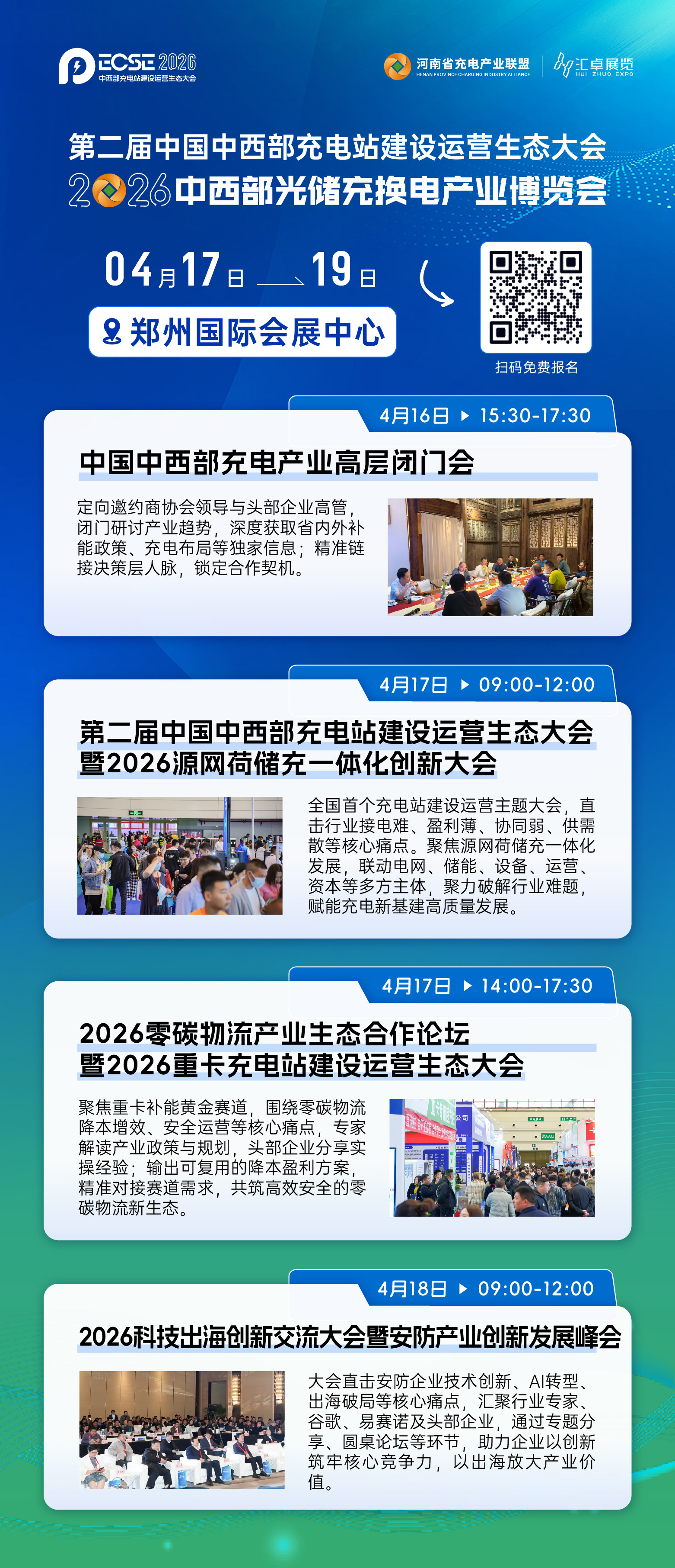 乘新能源产业发展东风,应“双碳”战略落地之需,备受行业瞩目的第二届中国中西部充电站建设运营生态大会暨2026中西部光储充换电产业博览会,将于2026年4月17日至19日在郑州国际会展中心盛大启幕。