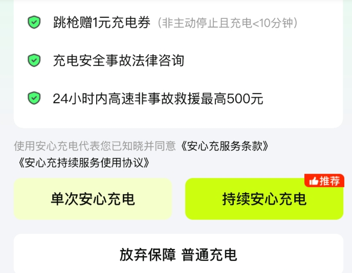 日前,记者来到十陵街道来龙充电站,发现现场部分充电枪表皮磨损严重,充电桩上贴满密密麻麻的各类小广告,记者费了一番功夫才从广告中找到充电二维码。值得注意的是,同一台设备上竟标注着新电途、快电两家不同运营平台的二维码。记者分别扫码后发现,新电途平台自动勾选“持续安心充电”选项,弹出安心充服务包,单次价格0.5元;快电平台则弹出月卡选项,标注每月月费3.5元。