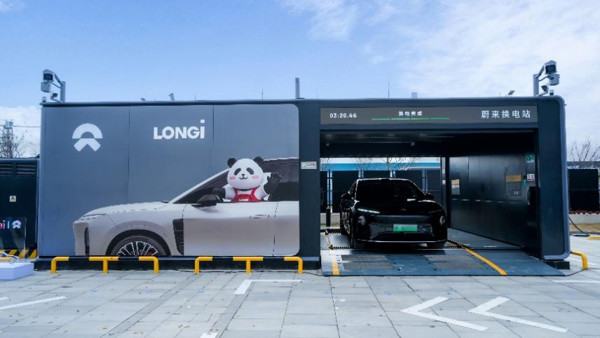 落成仪式上,蔚来ET9于全新落成的光伏换电站完成了首次换电服务。该换电站顶部全部采用隆基专为蔚来定制的Hi-MO X10全黑组件,搭载行业领先的BC电池技术,组件转换效率高达24.3%,确保了换电网络电力供给的绿色化与高效化。