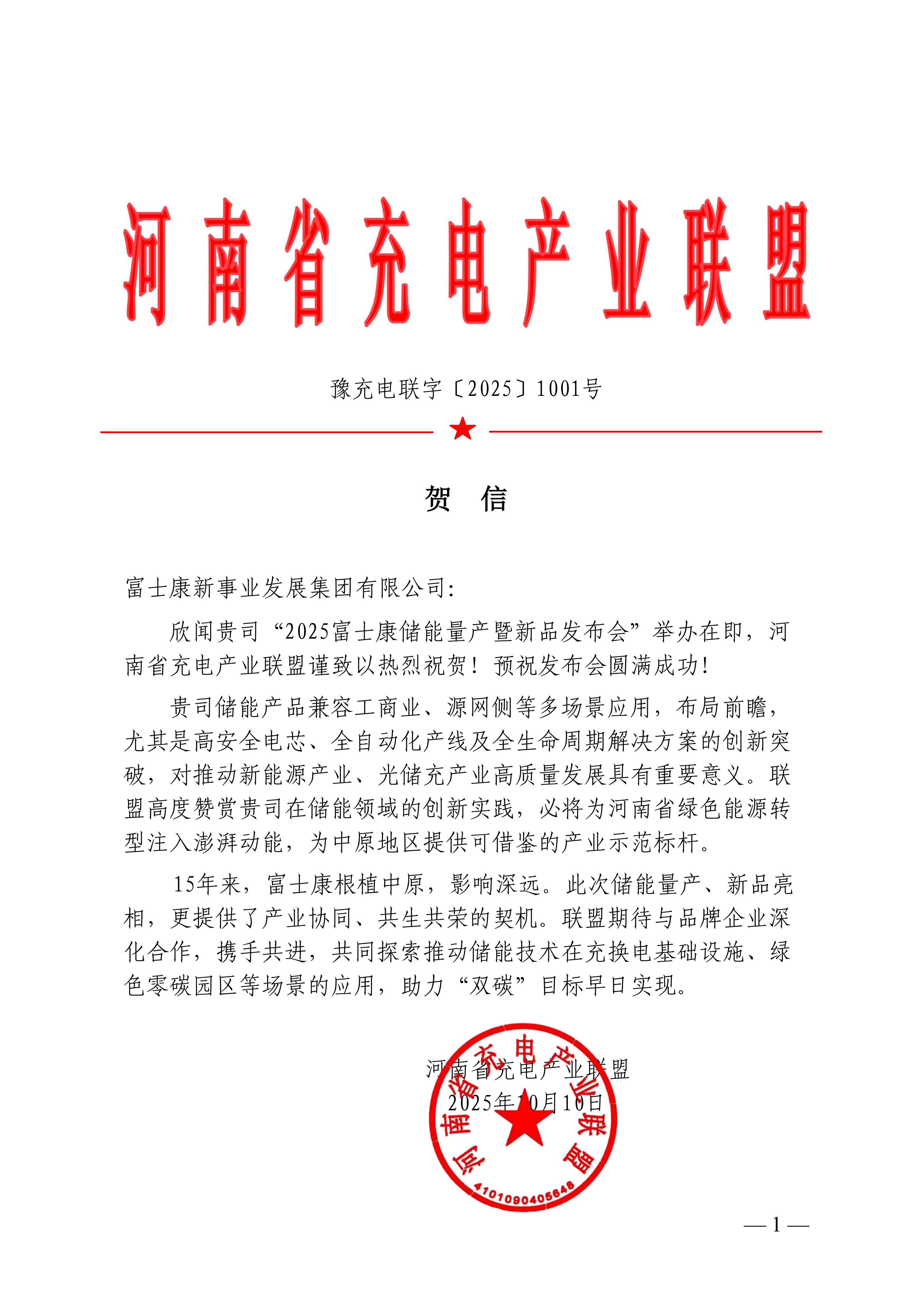 此前,河南省充电产业联盟为富士康新事业发展集团发去贺信,预祝储能量产暨新品发布会圆满成功!