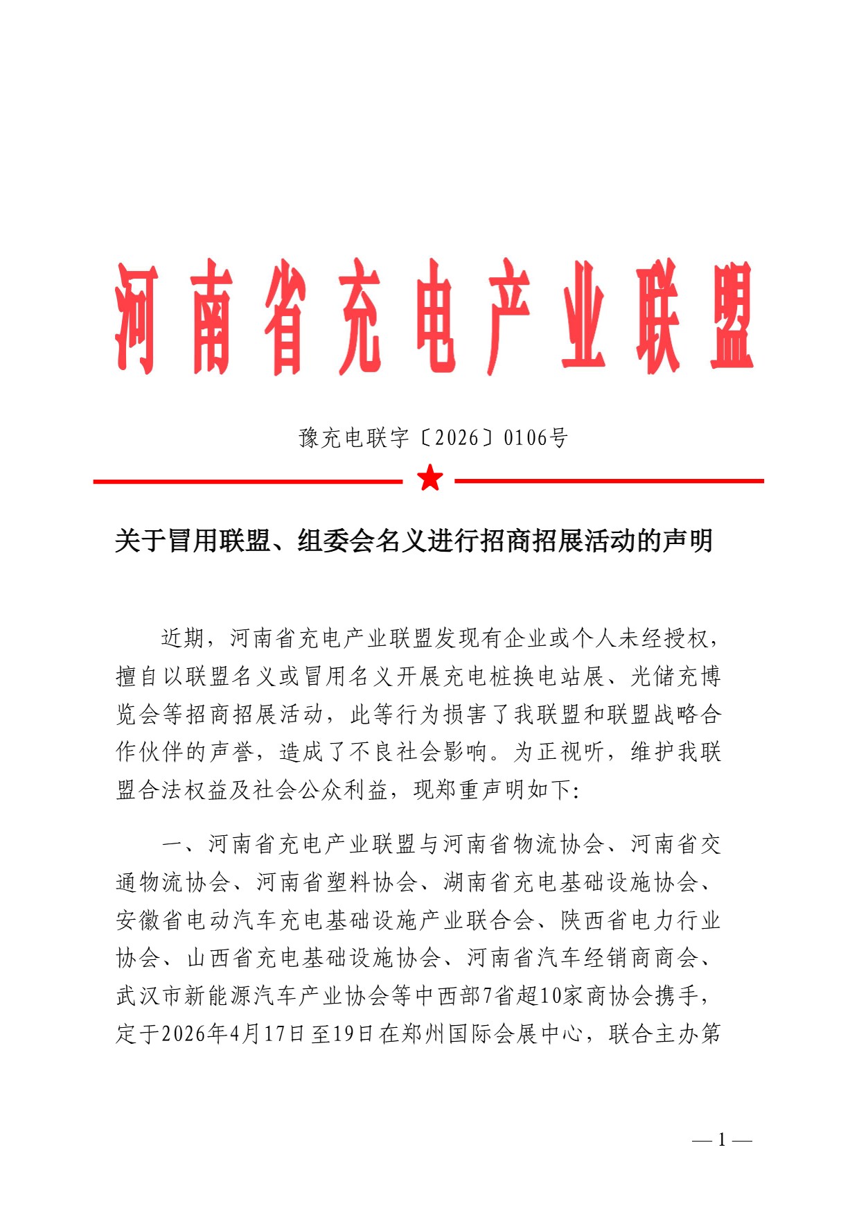 近期,河南省充电产业联盟发现有企业或个人未经授权,擅自以联盟名义或冒用名义开展充电桩换电站展、光储充博览会等招商招展活动,此等行为损害了我联盟和联盟战略合作伙伴的声誉,造成了不良社会影响。为正视听,维护我联盟合法权益及社会公众利益,现郑重声明如下:
