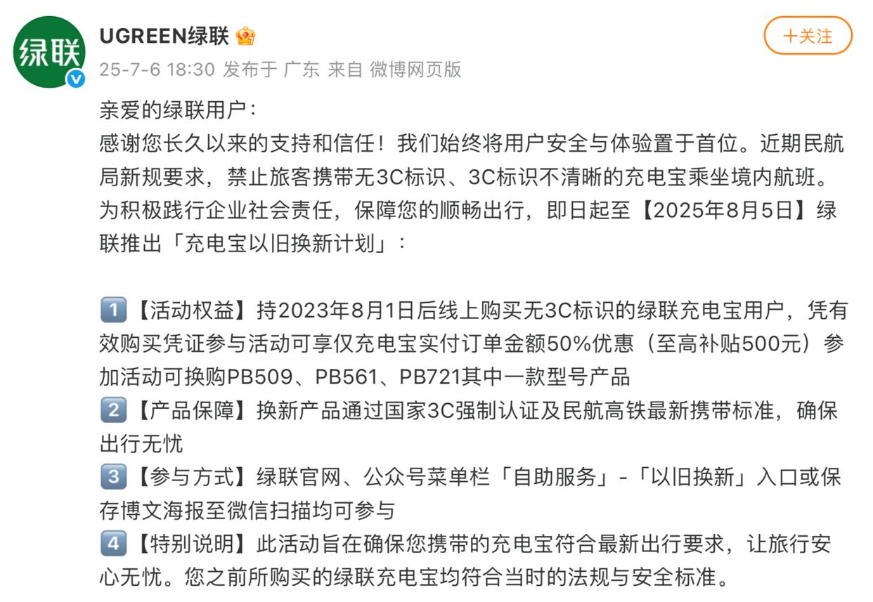 7月6日,绿联宣布自即日起至8月5日推出充电宝以旧换新计划,持2023年8月1日后线上购买无3C标识的绿联充电宝用户,凭有效购买凭证参与活动可享仅充电宝实付订单金额50%优惠(至高补贴500元)参加活动可换购PB509、PB561、PB721其中一款型号产品。换新产品通过国家3C强制认证及民航高铁最新携带标准,确保出行无忧。