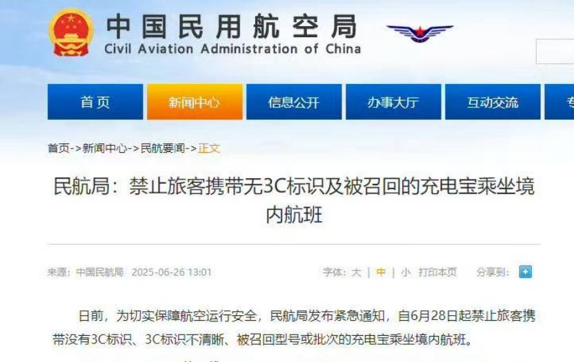 从6月28日起,禁止旅客携带没有3C认证或者属于召回批次的充电宝登机。