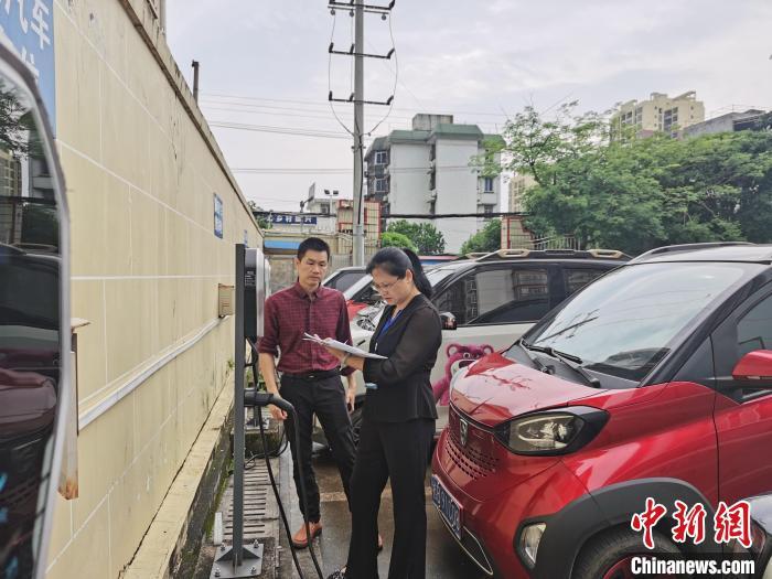 图为柳城县纪委监委驻县财政局纪检监察组在该县老旧小区,开展新能源汽车公用充电基础设施建设及运营管理情况专项监督检查。 龙然生摄