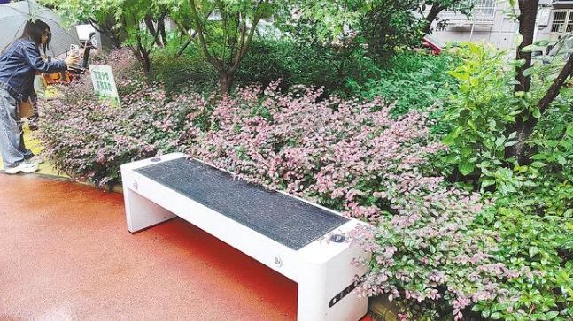 新华小区内集成光伏板、USB接口、蓝牙音响等多功能的光伏凳。 (湖北日报全媒记者 彭一苇 摄)