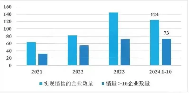 2021-2024年前10个月中国新能源重卡企业数量 图片来源:交强险