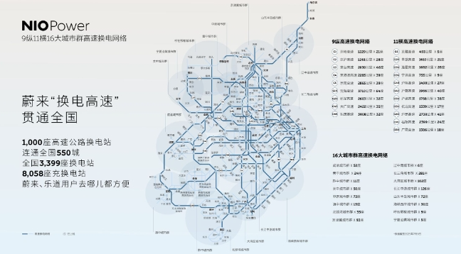 2025年7月9日,G5011芜合高速福山服务区(合肥方向)换电站正式上线,蔚来全国高速公路换电站总数突破1000座,建成覆盖全国的“9纵11横16大城市群”高速换电网络,连通全国550个城市。