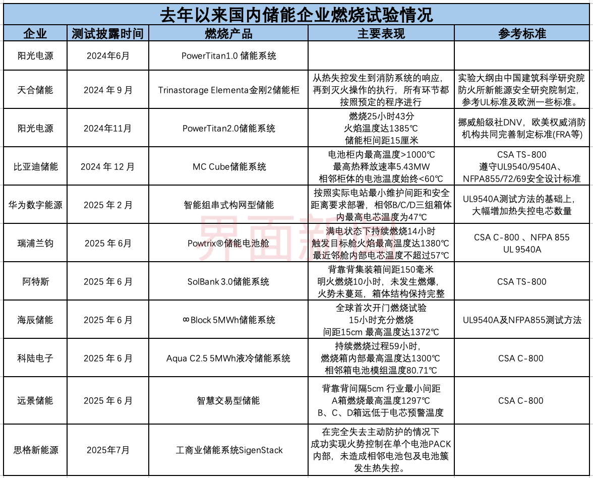 目前已进行过储能燃烧试验的相关企业中,少了宁德时代(300750.SZ)、海博思创(688411.SH)等龙头身影,界面新闻就此询问相关公司的考量,截至发稿未获得回应。