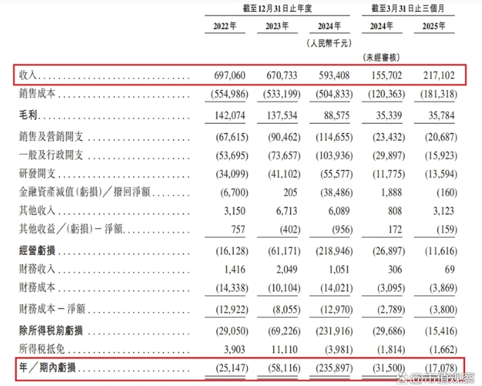 招股书显示,2022至2025年前三个月(简称报告期),挚达科技的营业收入分别为6.97亿元、6.71亿元、5.93亿元和2.17亿元,三年复合增长率为-7.73%,收入连年下滑。同期,其净利润分别为-2514.7万元、-5811.6万元、-2.36亿元和-1707.8万元,2024年亏损同比扩大306%,报告期内累计亏损超过3.36亿元。