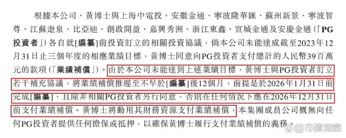 后续又通过补充协议将补偿支付推迟至2026年12月31日前,但是要求公司在2026年1月31日前完成上市。如若未能按期上市,可能引发黄志明进行股权质押或资产变卖还债的风险。