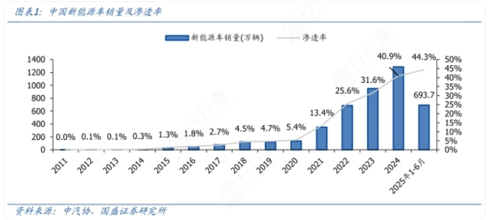 中国新能源车市场在过去几年经历了显著增长。从2011年至2025年(截至6月),新能源车销量和市场渗透率逐年上升。销量方面,2011年几乎可以忽略不计,但到2024年已突破1200万辆,而2025年前六个月销量达693.7万辆,展现出强劲势头。渗透率方面,从2011年接近零逐步提升至2024年的40.9%,并在2025年上半年进一步增至44.3%。这表明消费者对新能源车的接受度不断提高,政策支持与技术创新也起到了推动作用,预示着市场仍有巨大潜力。