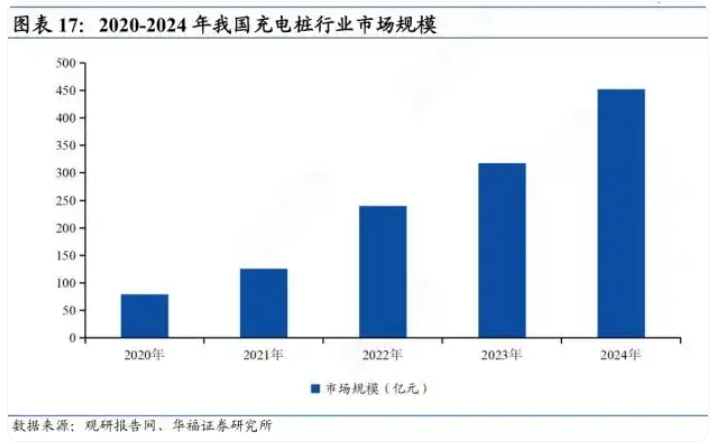 2020年至2024年,中国充电桩行业的市场规模显著增长。2020年约为80亿元,2021年增至130亿元,2022年达到240亿元,2023年进一步扩大至320亿元,2024年攀升至450亿元。这一持续扩张反映了市场需求和投资力度的增强,显示出行业未来发展空间广阔。