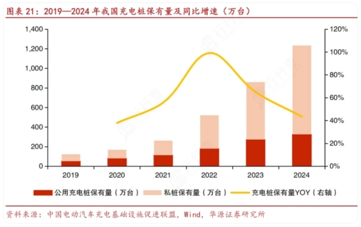 2019年至2024年,中国充电桩保有量快速增长,从2019年的约100万台增至2024年的超过1200万台。其中,私桩保有量增长尤为显著,占比最大。同比增长率在2021年达到峰值,接近120%,随后逐渐放缓,2024年降至约50%。尽管增速有所下降,但整体仍保持较高水平,体现了充电基础设施建设的快速推进,为电动车普及提供了坚实支撑。