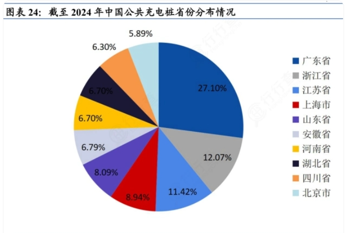 截至2024年,中国公共充电桩分布呈现明显地域差异。广东省以27.10%的比例位居首位,浙江省以12.07%紧随其后,江苏省和上海市分别占比11.42%和8.94%。此外,山东、安徽、河南、湖北、四川和北京的占比分别为8.09%、6.79%、6.70%、6.70%、6.30%和5.89%。这些数据表明公共充电桩主要集中在经济发达的东部和南部地区,与当地电动车普及率密切相关,反映了区域发展特点和战略重点。