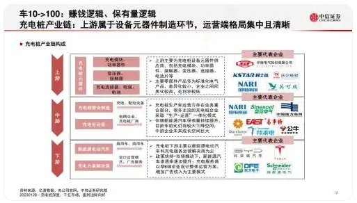 充电桩产业链分为上游、中游和下游三个环节。上游包括元器件和零部件供应商,如充电模块、功率器件、变压器等,代表企业有许继电气、科士达、沃尔核材等。中游涵盖整桩生产和运营,特来电、星星充电、南方电网等为代表企业。下游是终端用户和电动车制造商,包括福特、宝马、比亚迪、特斯拉等。各环节分工明确,协同推动新能源汽车产业发展。