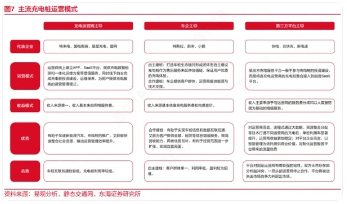 主流充电桩运营模式主要包括运营商主导、车企主导和第三方平台主导三类。运营商主导模式以特来电、星星充电为代表,线上提供APP、SaaS平台及增值服务,线下负责投资建设和运维保养。车企主导模式以特斯拉、蔚来、小鹏为代表,收入来源主要是充电服务费和电费差价。第三方平台主导模式以快电、云快充为代表,收入来自服务费分成和大数据增值服务。