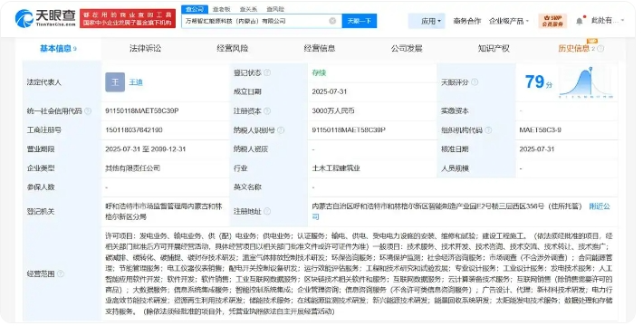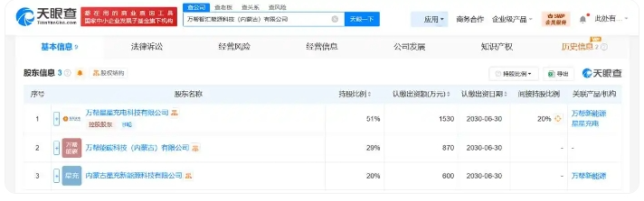 每经快讯,天眼查App显示,近日,万帮智汇能源科技(内蒙古)有限公司成立,法定代表人为王迪,注册资本3000万元人民币,经营范围含发电业务、输电业务、供(配)电业务,碳减排、碳转化、碳捕捉、碳封存技术研发,温室气体排放控制技术研发,节能管理服务,工程和技术研究和试验发展,人工智能应用软件开发,互联网数据服务等。股东信息显示,该公司由万帮星星充电科技有限公司、万帮能碳科技(内蒙古)有限公司、内蒙古星充新能源科技有限公司共同持股。