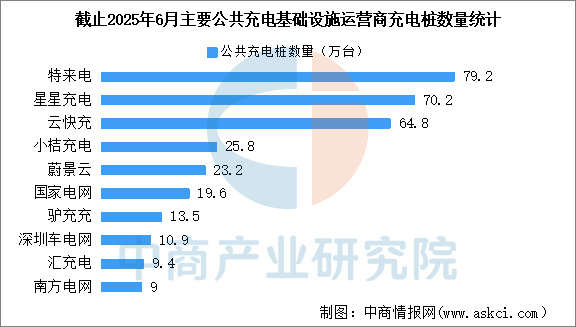 截止到2025年6月,全国充电运营企业所运营充电桩数量TOP10,分别为:特来电运营79.2万台、星星充电运营70.2万台、云快充运营64.8万台、小桔充电运营25.8万台、蔚景云运营23.2万台、国家电网运营19.6万台、驴充充运营13.5万台、深圳车电网运营10.9万台、汇充电运营9.4万台、南方电网运营9.0万台。