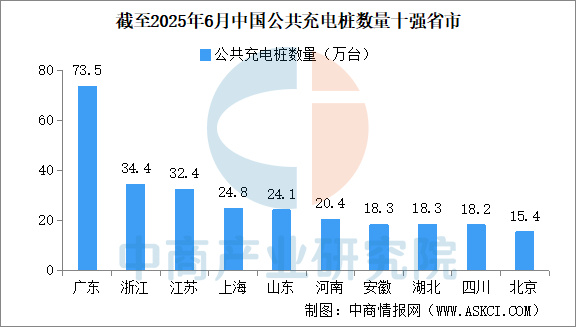 中商情报网讯:截至2025年6月底,我国公共充电设施(枪)409.6万台,同比增长36.7%。广东、浙江、江苏、上海、山东、河南、安徽、湖北、四川、北京TOP10地区建设的公共充电桩占比达67.0%。其中,广东公共充电桩保有量最高达73.5万台。