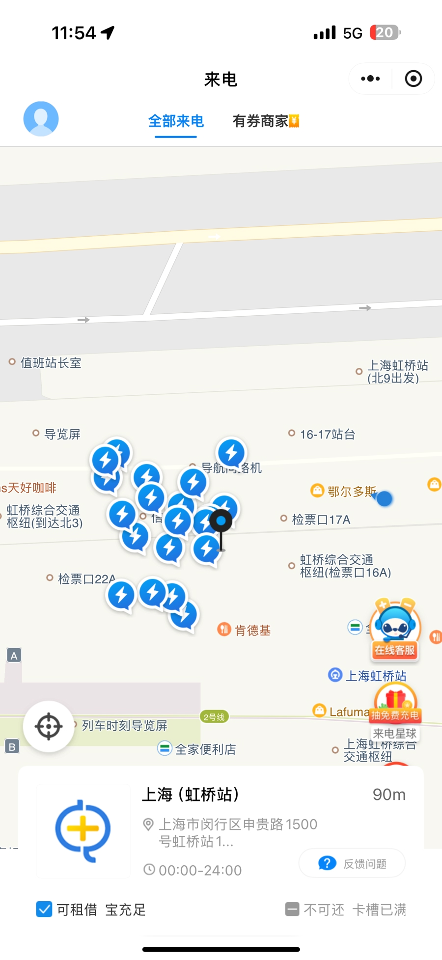 虹桥站内的免费充电区域较少,共享充电宝品牌布局则相对复杂。站内同时设有“醒电”和“来电”两个品牌,“来电”设备多集中在三楼餐饮区及自动售货机附近,“醒电”则主要分布在靠近检票口一侧。不同品牌“楼上楼下”分布,旅客若未提前了解,很容易混淆。市民黄女士曾在三楼借了“来电”,误以为检票口附近也可以归还,结果只找到“醒电”设备,因品牌不兼容,最终不得不折返三楼到原租借点进行归还,“差点误了检票时间”。