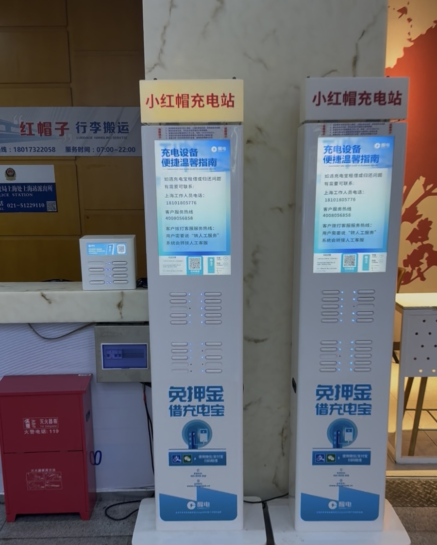 上海火车站内的共享充电宝设施,最上方小字中有提及“建议本站内归还”。
