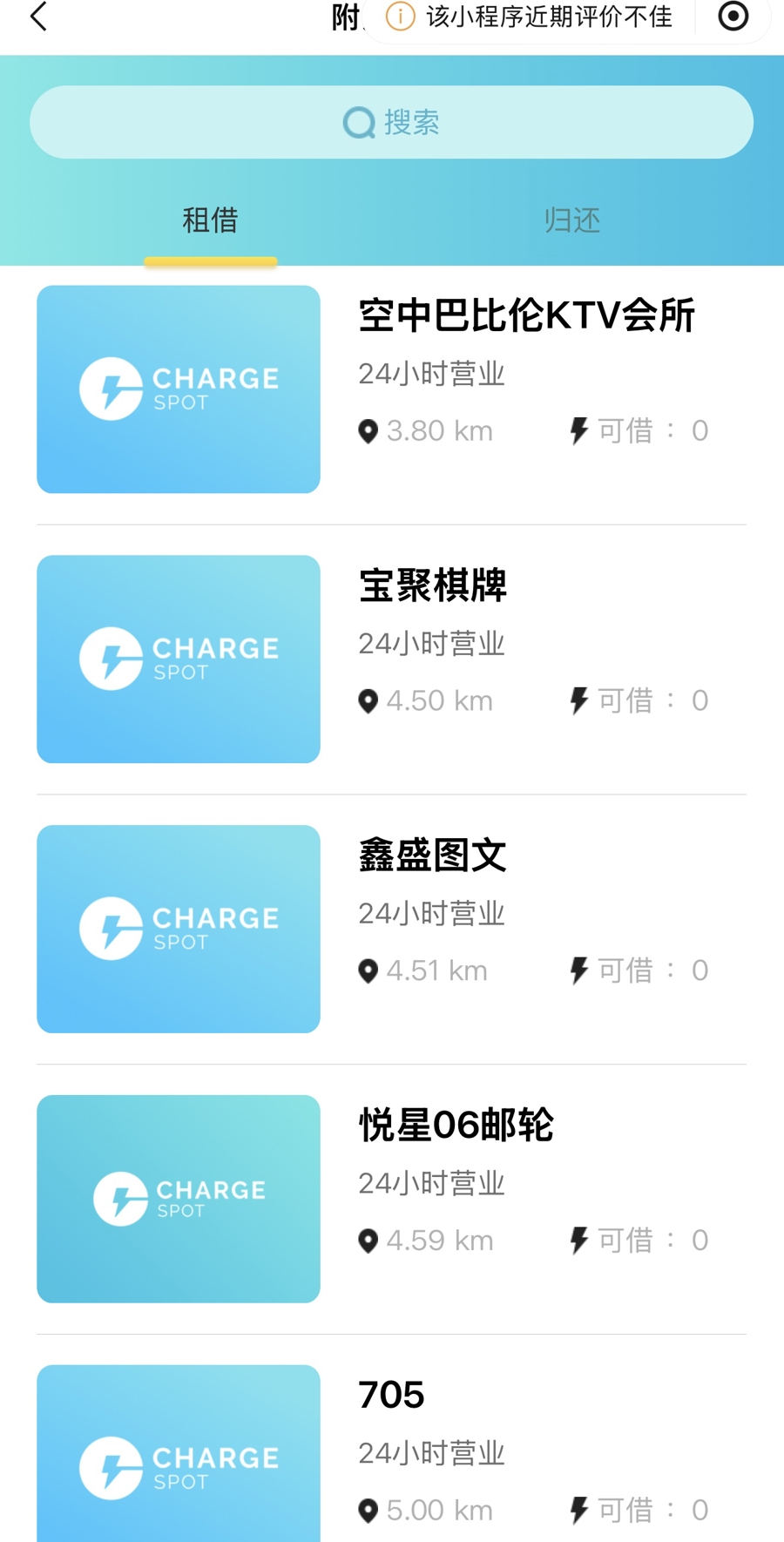代理称,醒电品牌此前铺设范围较广,但现在小程序上仍保存一些归还点,但可借、可还数量均为0台。