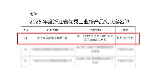 近日,浙江经信厅公布了《2025年度浙江省优秀工业新产品拟认定名单》。万马新能源的“基于实时以太网及主动分配矩阵的直流群充系统”成功入选,标志着万马新能源在省级层面再获权威认证。