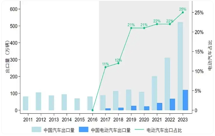 过去十年间,新能源汽车产业的销量呈现前稳后快的增长态势:2020年前保持稳步增长,之后实现爆发式突破。从全球贸易角度看,中国汽车出口量持续攀升,其中电动汽车对出口的贡献非常突出。目前中国已跃居为全球第一大汽车出口国。(如图1、2所示)