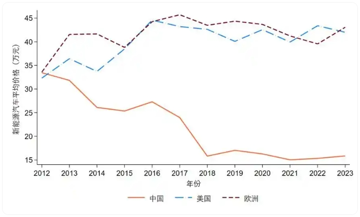 中国新能源汽车的国际竞争力不仅体现在市场规模,更在于显著的价格优势。经过十余年发展,行业平均价格显著下降,较美欧同类型产品已形成明显价格差(如图3)。这一价格优势为新兴产业走向国际市场指明了方向:只有持续推动降本增效,才能在国际竞争中保持领先地位。