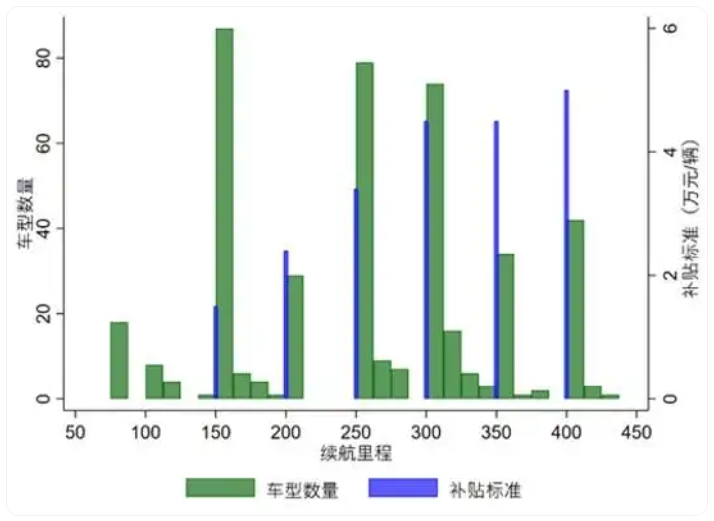 高续航里程车型能享受更高补贴,车企也因此更多推出高续航里程车型。图5展示的是2018年不同续航里程区间的车型数量,在补贴门槛值附近的区间,车型较为集中,这表明车企为了获得更高补贴而不断投入技术创新,增加续航里程。