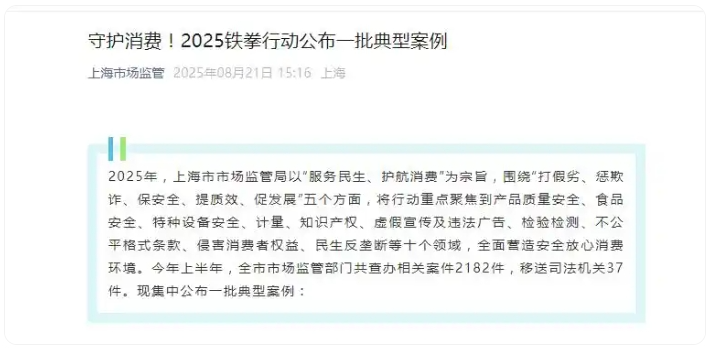 2025年,上海市市场监管局以“服务民生、护航消费”为宗旨,围绕“打假劣、惩欺诈、保安全、提质效、促发展”五个方面,将行动重点聚焦到产品质量安全、食品安全、特种设备安全、计量、知识产权、虚假宣传及违法广告、检验检测、不公平格式条款、侵害消费者权益、民生反垄断等十个领域,全面营造安全放心消费环境。今年上半年,全市市场监管部门共查办相关案件2182件,移送司法机关37件。现集中公布一批典型案例: