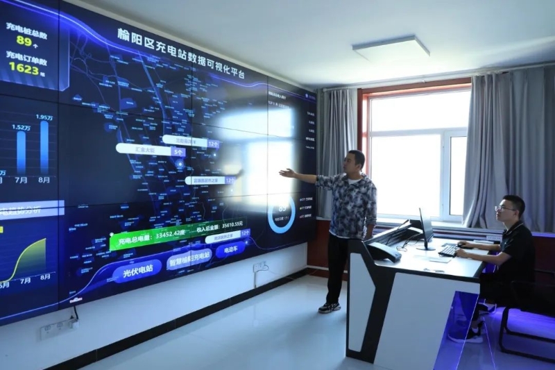 工作人员通过榆阳区充电站数据可视化平台介绍新能源汽车充电站建设及运营情况