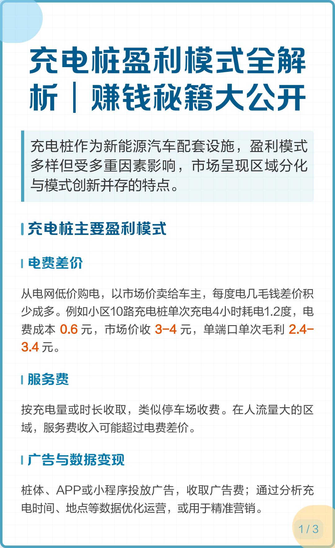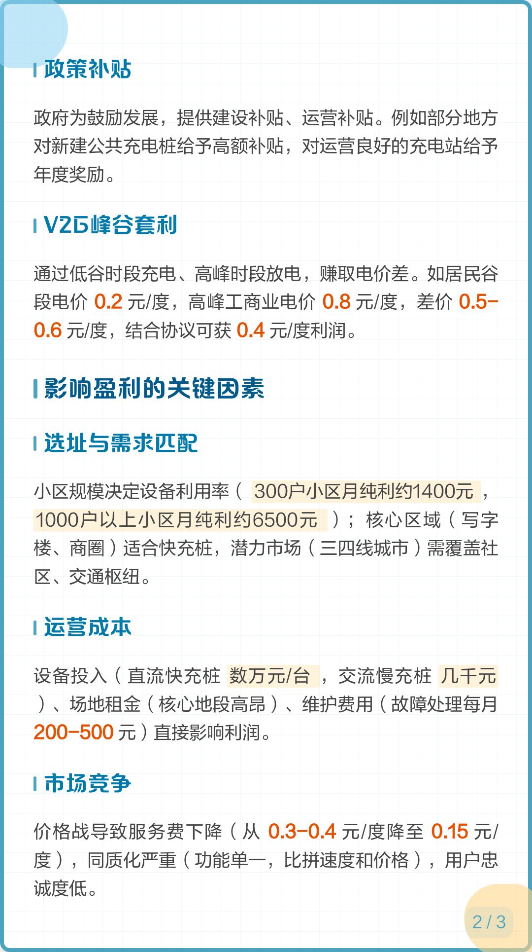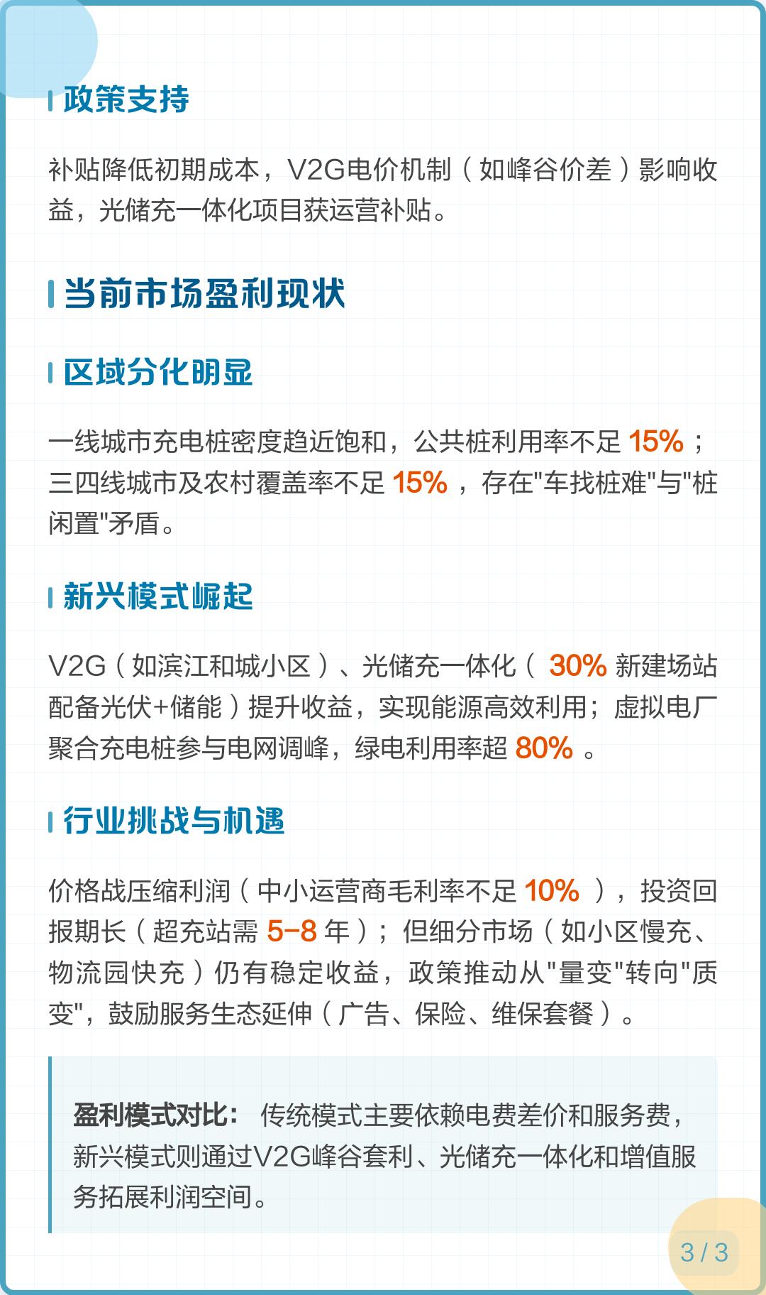 中小运营商毛利率跌至10%以下;超充站回报期4-8年;二三线小区慢充毛利20-35%;物流园重卡快充站因服务刚性受价格战影响小;政策转向综合质量提升,改为对整站和综合充电量进行补贴;推荐光储充停一体化充电站,推行“充电+保险+维保+服务”套餐。