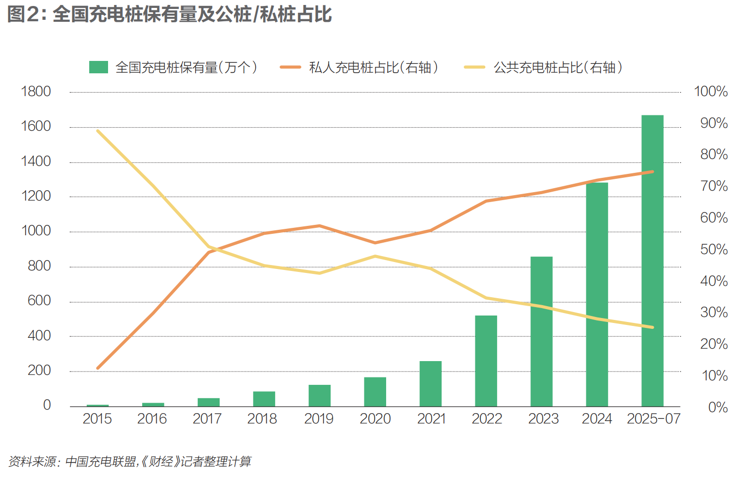 2018年前后,随着网约车电动化加速,公共桩快速发展,社会资本开始涌入。2020年后,新能源车销量爆炸式增长,包括两桶油在内的各类央国企、地方国资也纷纷下场。同时私家车成为消费主力,中国电动汽车充电基础设施促进联盟(下称“中国充电联盟”)数据显示,私人充电桩数量占比从2021年的56%上升到2025年7月底的75%。