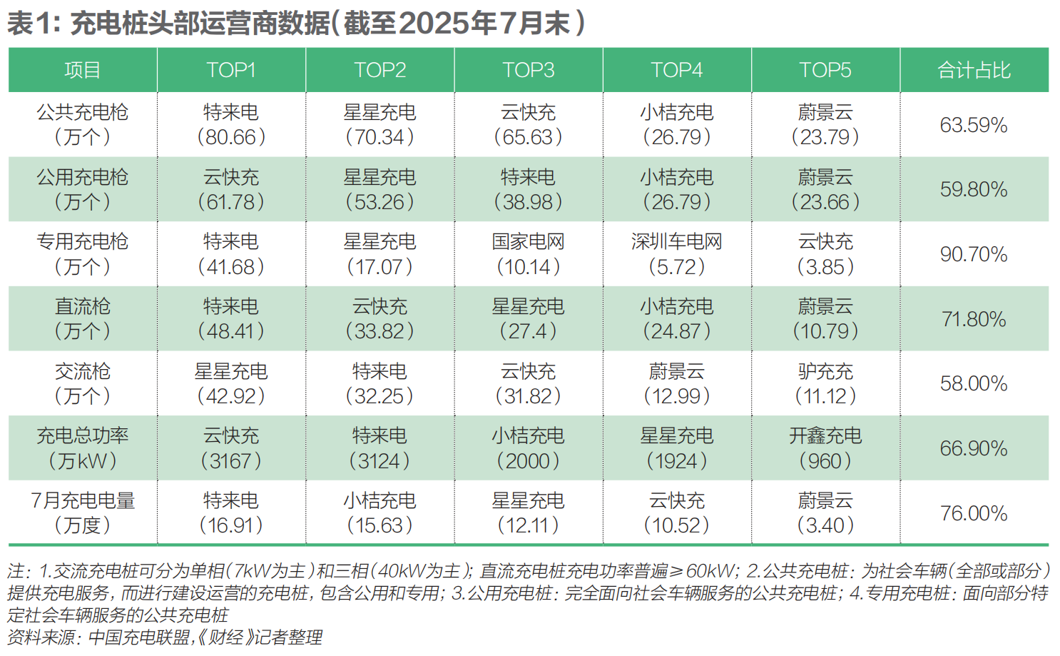 而充电站市场,根据国家能源局数据,规模以上的充电运营服务商中,民营企业占比超过80%。根据充电联盟的数据,截至2025年7月,公共充电设施运营商的前五名分别是特来电、星星充电、小桔、云快充、蔚景云,均为民营企业。