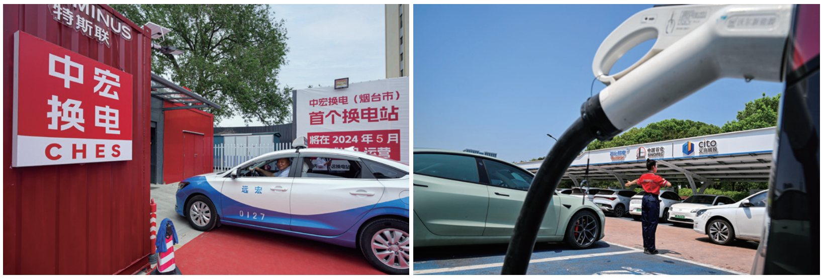 左图:2024年5月30日,新能源出租车在山东烟台一家换电站更换电池。图/中新