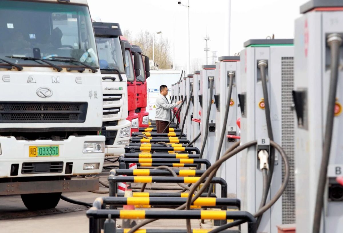 重卡在河北唐山市曹妃甸区一处充电站充电。 本版图/新华