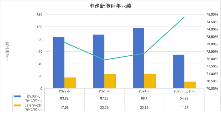 2025年上半年,电建新能实现营业收入54.72亿元,同比增长超过8个百分点;归母净利润11.27亿元,同比下滑16%。