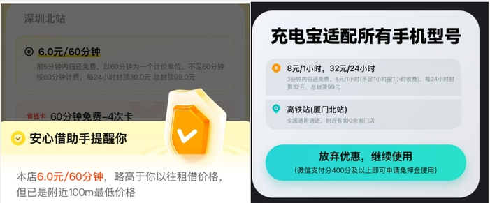 在深圳北站,蓝鲸科技记者使用美团共享充电宝时,显示收费为6元/60分钟,24小时封顶30元,总封顶99元,并主动提示“当前价格较过往偏高”;厦门北站的怪兽充电价格更高,达到每小时8元,封顶标准相近。
