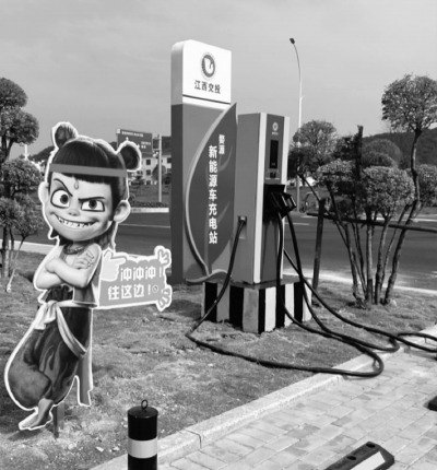 记者看到,很多地方为了缓解高峰期压力,在服务区出口附近设置了充电桩。图为江西婺源收费站综合服务站。