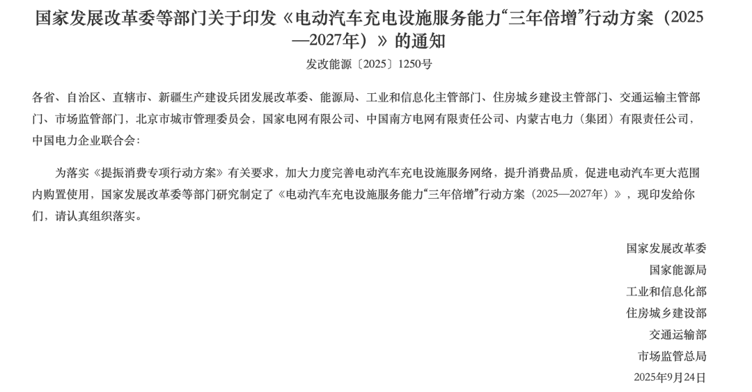 这就要提到近期发布的《电动汽车充电设施服务能力“三年倍增”行动方案(2025—2027年)》。