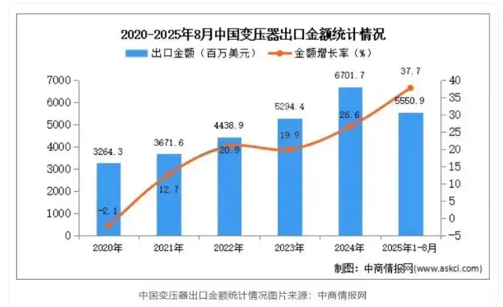 2025年1-8月份,我国变压器累计出口金额达到297.11亿元,同比51.42%,如果将时间线拉长一些,自2021年,我国变压器出口金额已连续4年高增长。