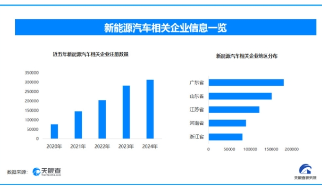 天眼查专业版数据显示,截至目前我国现存在业、存续状态的新能源汽车相关企业超164.2万家。其中,2025年截至目前新增注册相关企业约30.4万余家,从企业注册数量趋势来看,近五年间,新能源汽车相关企业的注册数量呈现出逐年增长的态势,并在2024年达到顶峰。