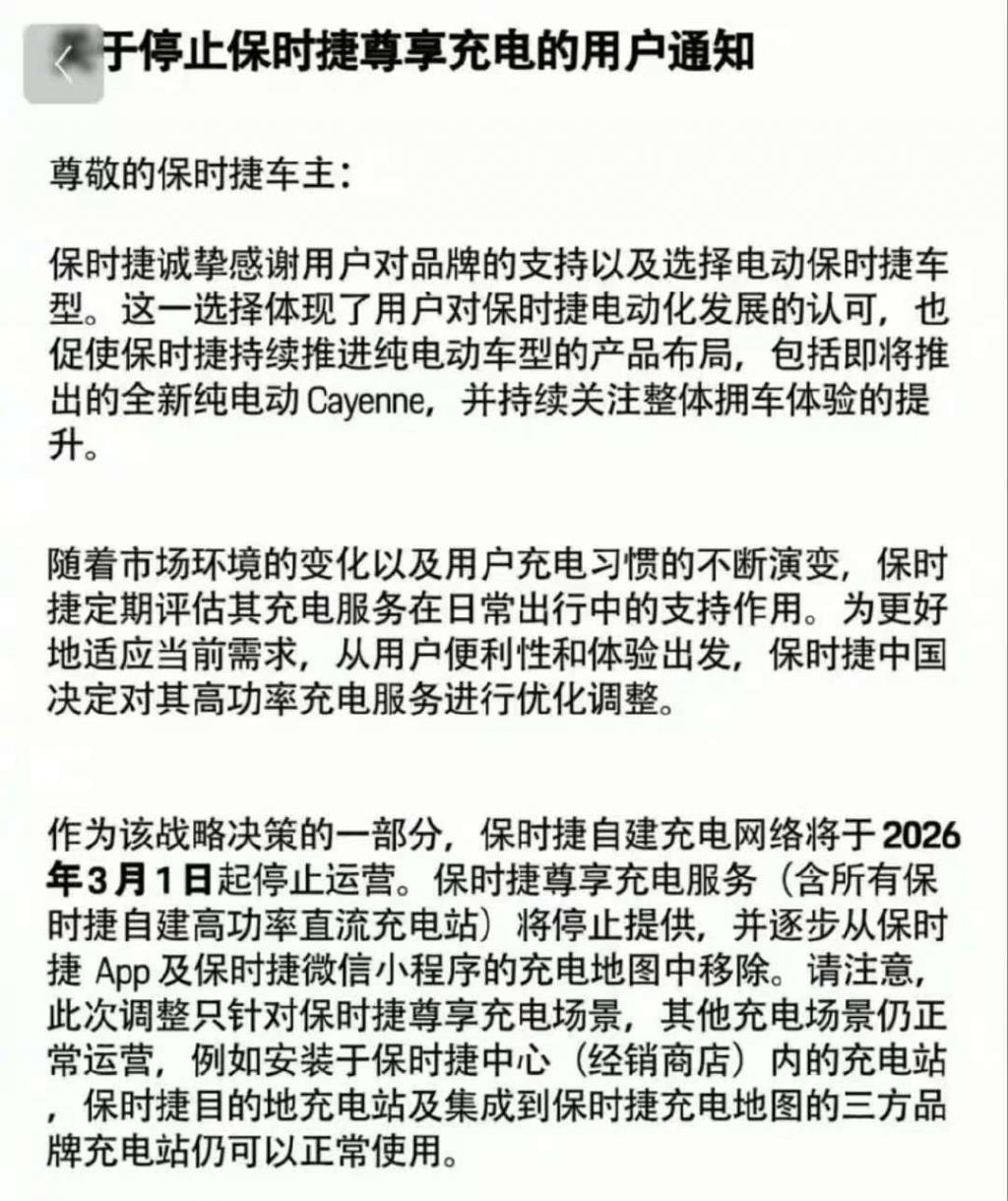 2025 年 12 月 22 日,保时捷中国发布《关于停止保时捷尊享充电的用户通知》,自 2026 年 3 月 1 日起,全国约 200 座保时捷自建充电站将逐步停止运营。