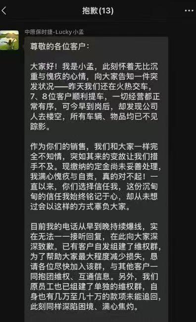 2025 年 12 月 25 日,河南郑州一保时捷门店疑似 " 跑路 " 的消息,留下众多已付定金或车款的消费者以及被欠薪的员工,涉及金额从数万元到数十万元不等。保时捷中国回应称:" 我们高度关注保时捷授权经销商郑州中原保时捷中心出现经营异常情况,目前与警方和相关部门在现场核查事实。"