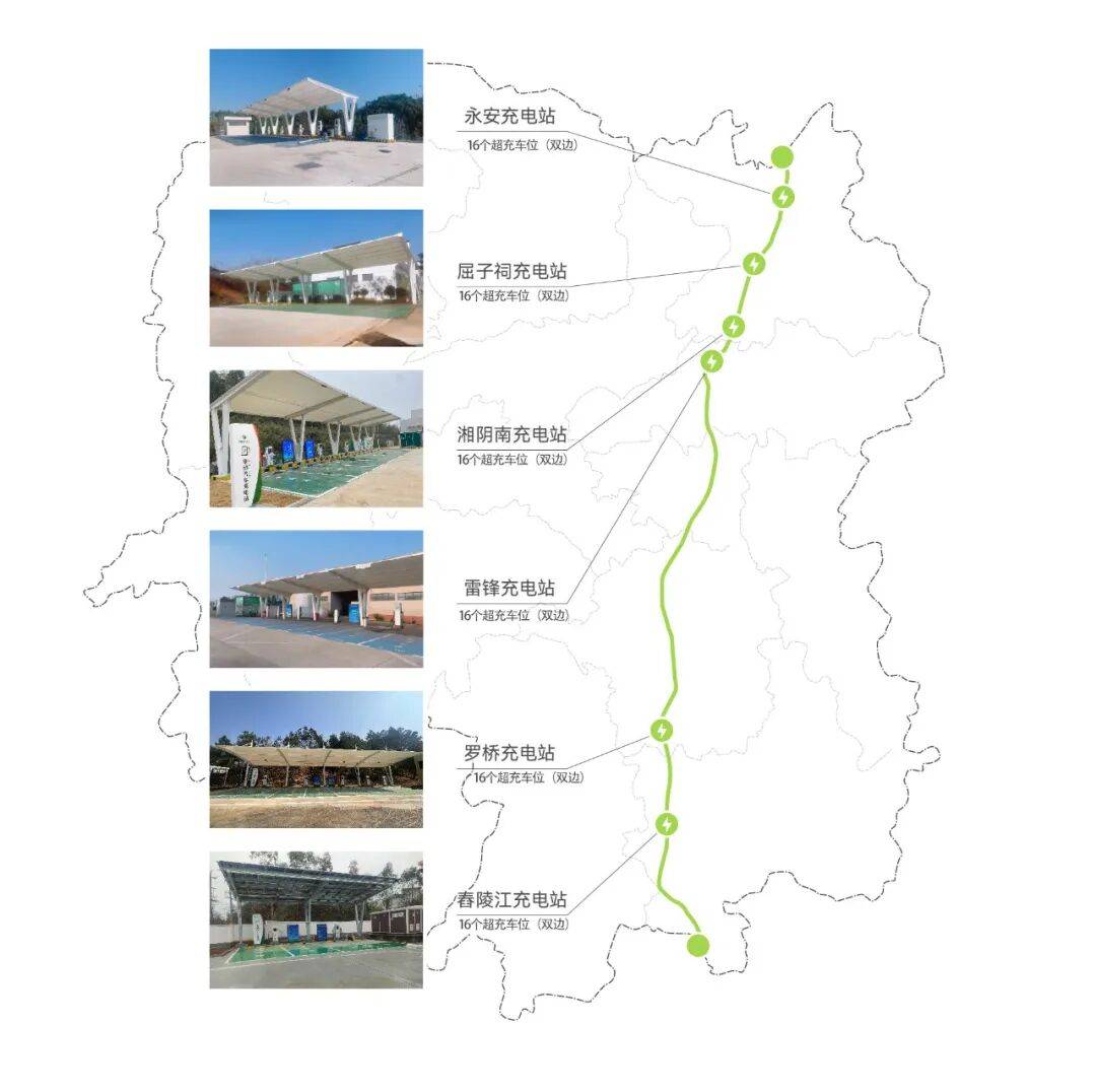 特色站点雨后春笋般拔地而起,投运全国首个红色主题全液冷超充示范站——韶山红星充电港;打造湖南省建设标准最高、综合业态最全的长沙市芙蓉区“光储充换服”一体化项目;在醴娄高速湘乡南服务区建设全省首对高速服务区重卡充电站,在沪昆高速邵东服务区与宁德时代合作建设全省首对服务区重卡换电站。
